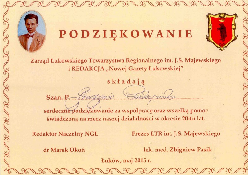 16 maja 2015r. Łukowskie Towarzystwo Regionalne im. Jana Stanisława Majewskiego oraz „Nowa Gazeta Łukowska” świętowały XX lecie swojej działalności.