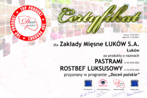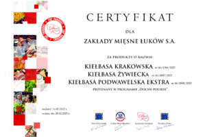 Z dumą informujemy, że Zakłady Mięsne Łuków S.A. zdobyły 3. miejsce w ogólnopolskim konkursie „Smak Jakości” w kategorii „Smak Natury”! Rozstrzygnięcie konkursu nastąpiło podczas Targów Marek Własnych FUTURE PRIVATE LABELS w Kielcach 6 listopada 2024 r. Nasza Szynka z tłuszczykiem, wyróżniająca się doskonałym, tradycyjnym smakiem oraz najwyższą jakością, została doceniona przez ekspertów (przedstawicieli sieci handlowych, […]