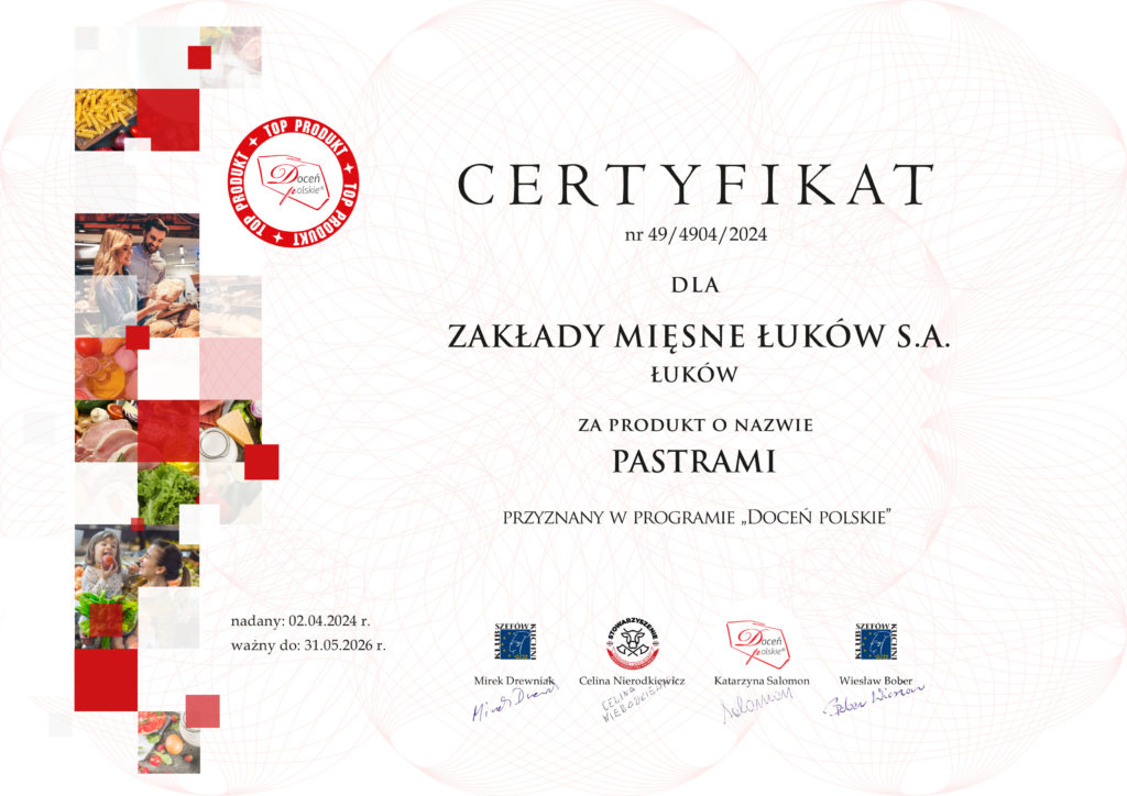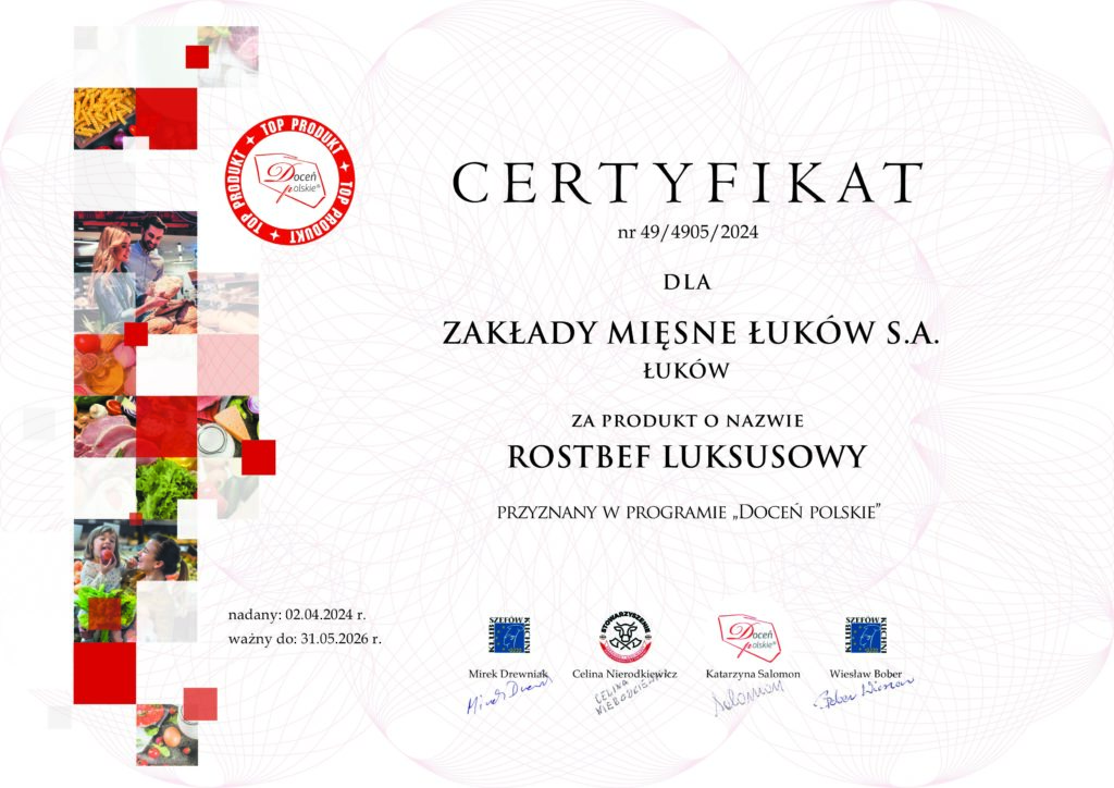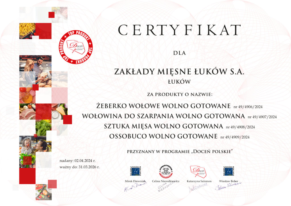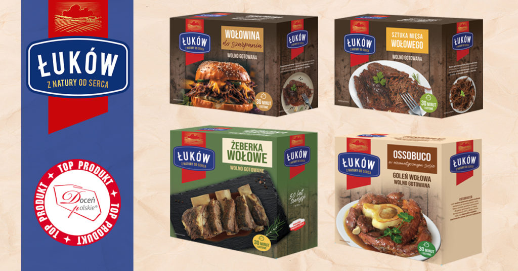 Wolno gotowane mięsa wołowe – Żeberka, Wołowina do szarpania, Gulasz, Sztuka mięsa oraz Ossobuco w aromatycznym sosie to produkty marki Łuków, które zdobyły najwyższe oceny we wszystkich kategoriach ocenianych przez członków Loży Ekspertów w ramach Ogólnopolskiego Programu Promocyjnego „Doceń polskie”. Odznaczone już wcześniej tym certyfikatem produkty Rostbef luksusowy oraz Pastrami wołowe zostały ponownie po dwóch latach poddane kontrolnej ocenie, dzięki czemu ponownie doceniono ich jakość i przyznano przedłużenie certyfikatu.