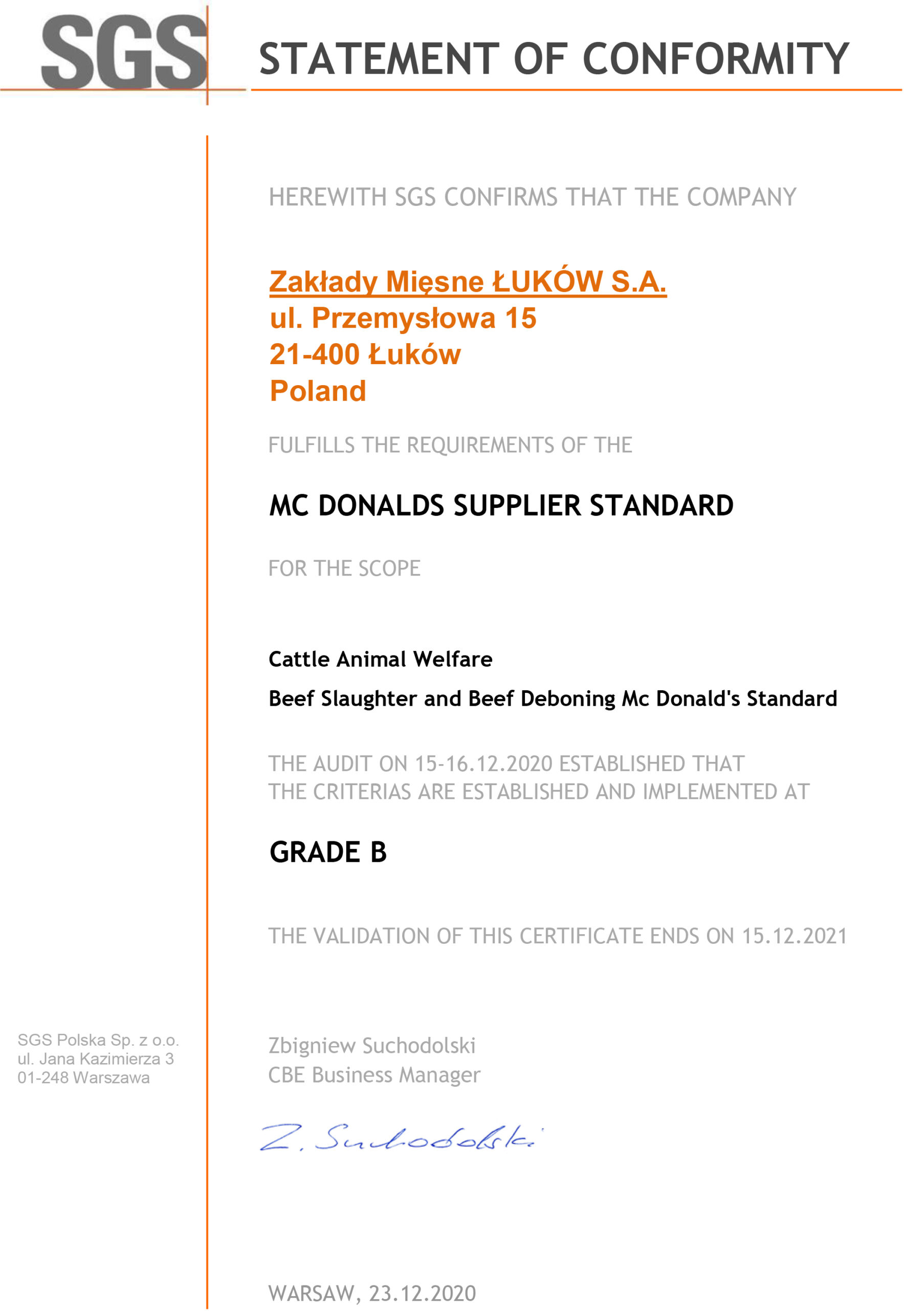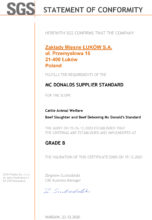 Certificate of conformity with the McDonald's standard in respect of slaughter of beef and de-boned beef granted by SGS.