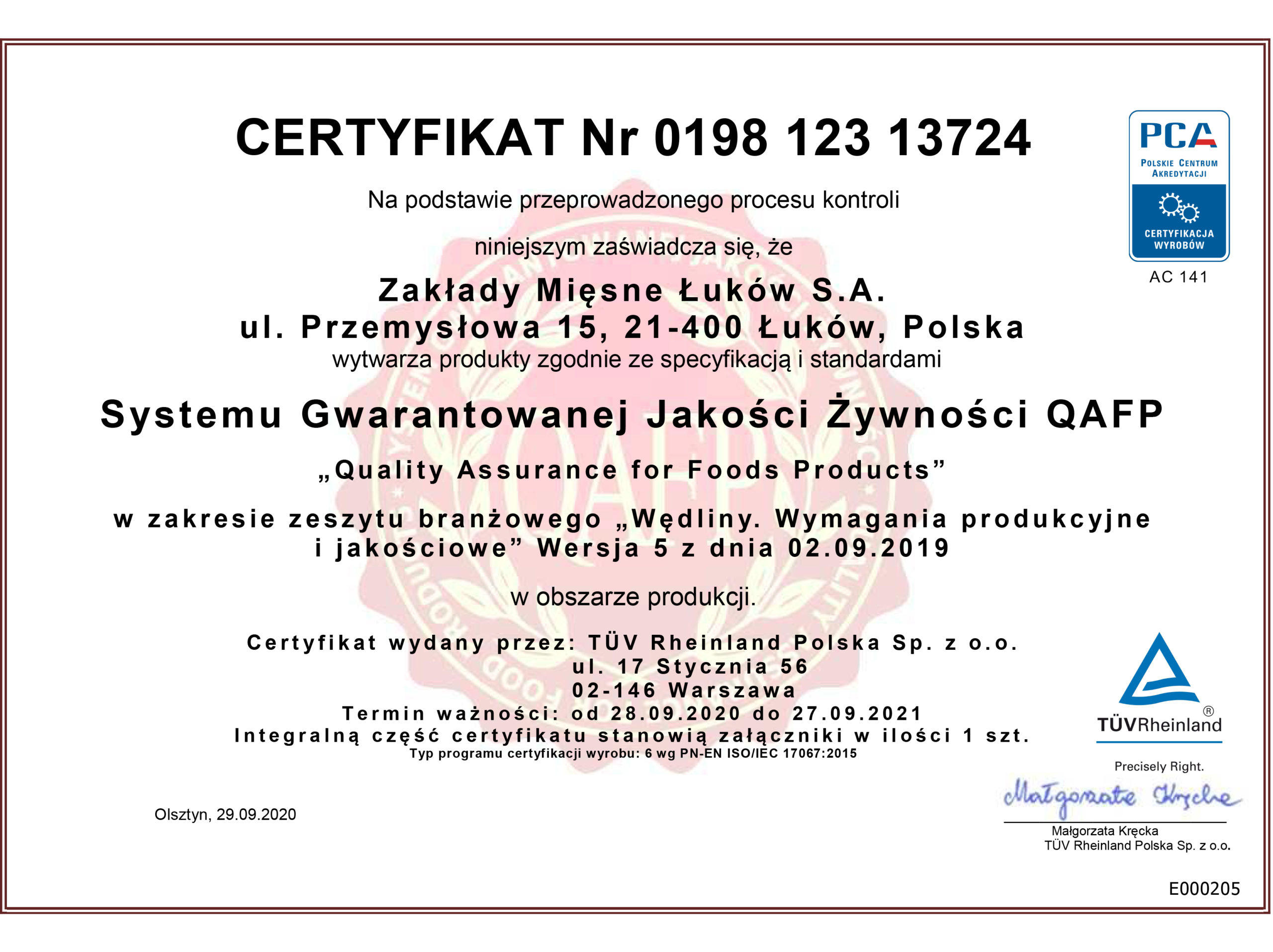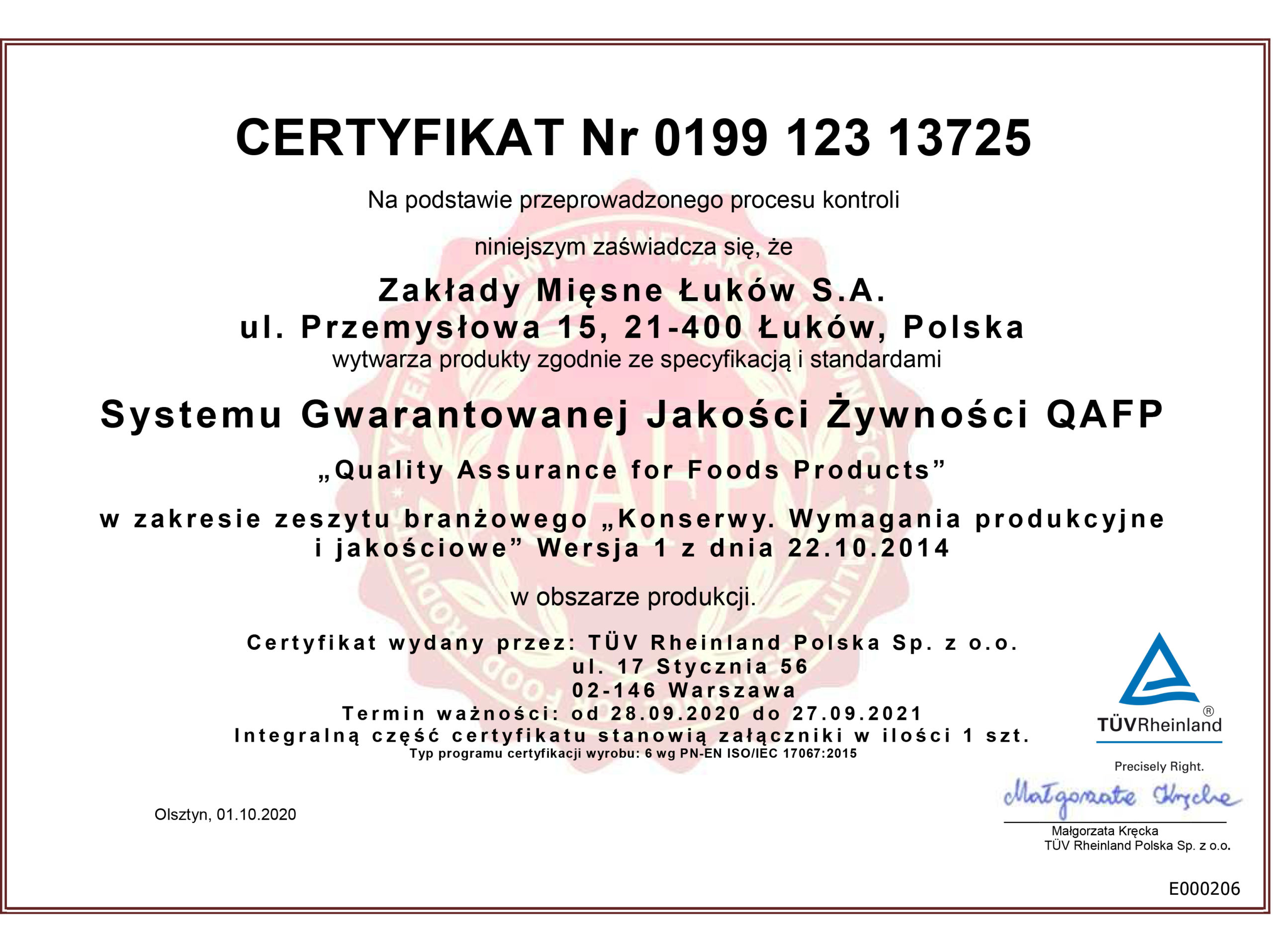Quality Assurance for Food Products QAFP Certificate in respect of the industry book "Cold Meats. Production and quality requirements" in the field of processing
