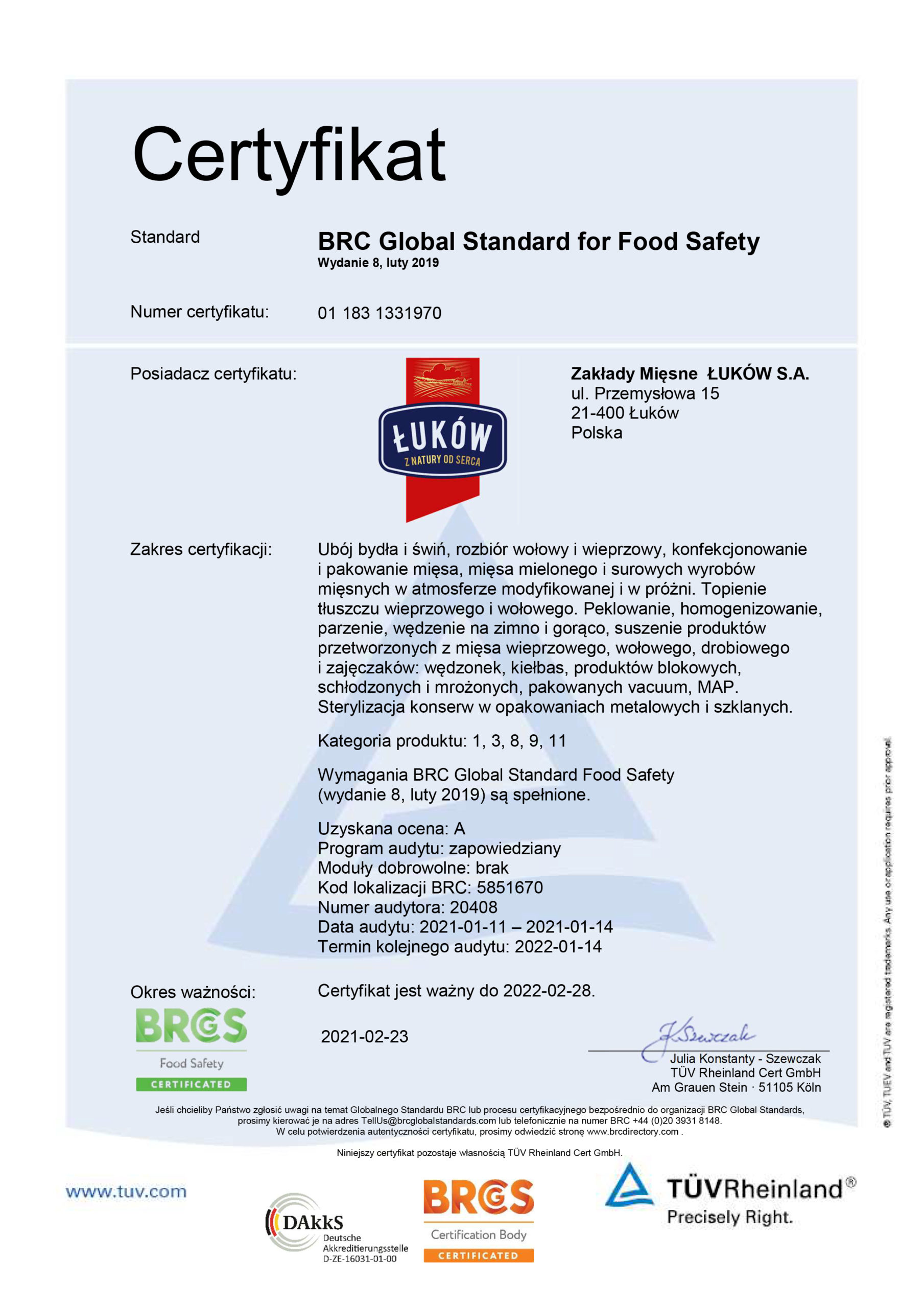 Certyfiikat Systemu Zarządzania BRC Food
