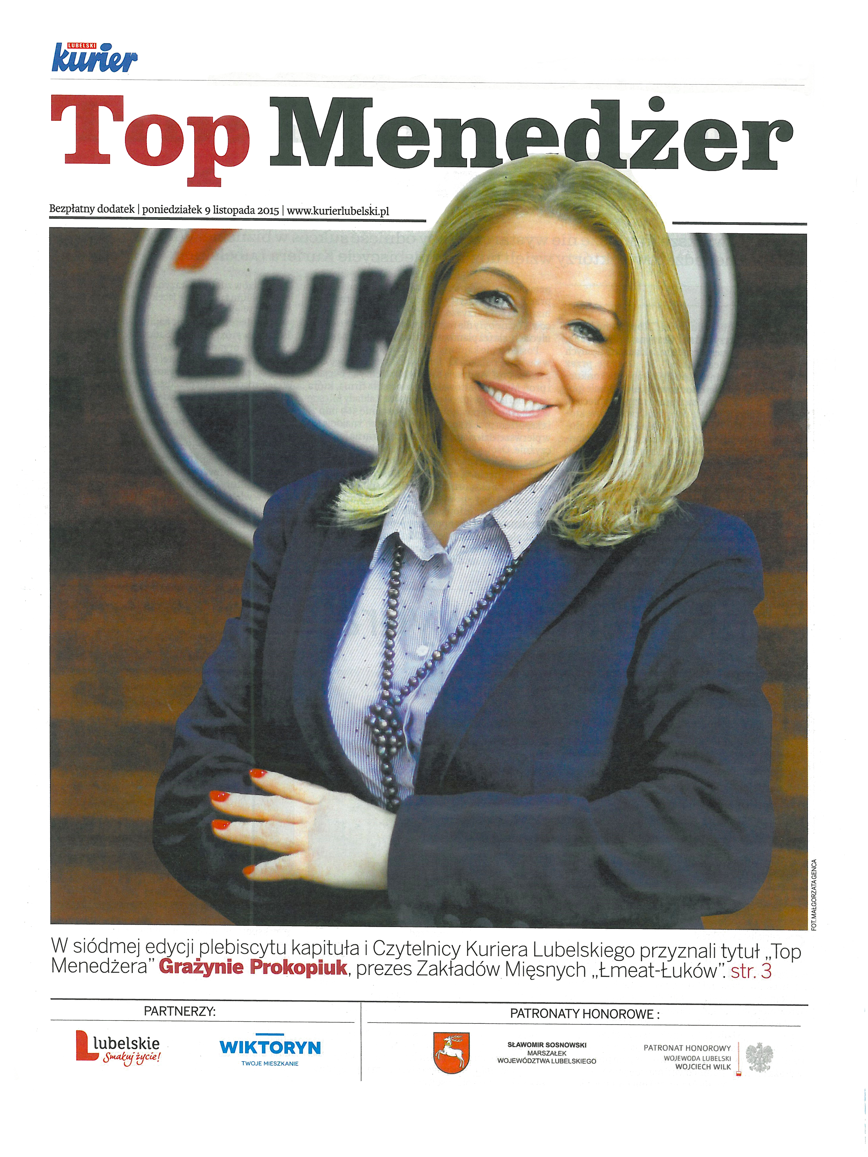 Miło nam poinformować, że Grażyna Prokopiuk – Prezes Zakładów Mięsnych „Łmeat-Łuków” S.A. – 6 listopada 2015 r. została uhonorowana tytułem Top Menadżera 2015 w siódmej edycji plebiscytu organizowanego przez Kurier Lubelski.