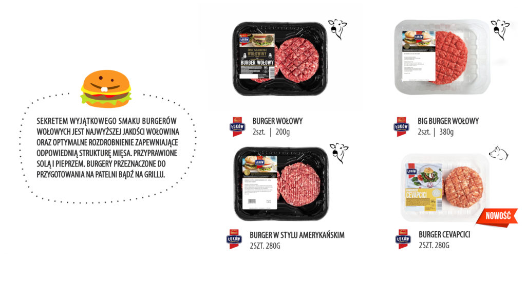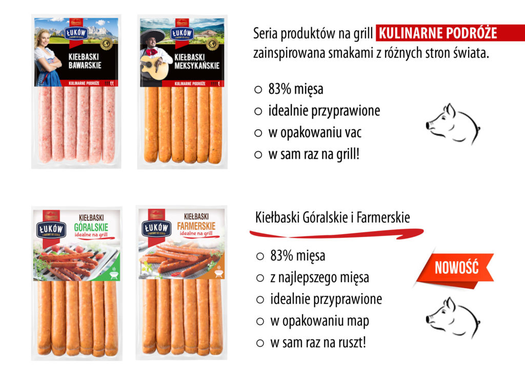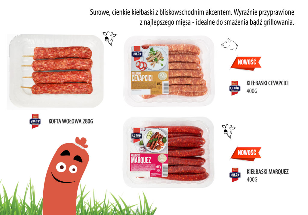 W ofercie grillowej Łukowa każdy znajdzie coś dla siebie – fani tradycji mogą wybierać spośród wielu rodzajów kiełbas i kaszanek, amatorzy wołowiny mogą wrzucić na ruszt soczyste steki, mięsiste burgery i wyraziste kofty. W propozycjach znalazły się też zyskujące coraz większą popularność kiełbaski cienkie – zarówno surowe, jak i parzone.