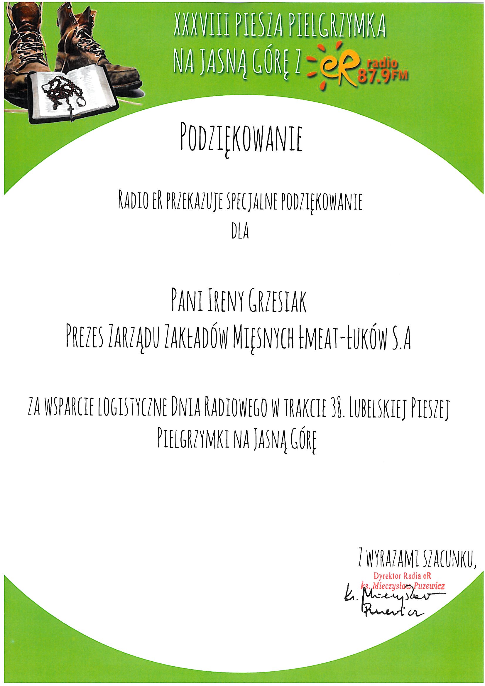 Na szlaku jasnogórskim towarzyszyło pielgrzymom radio eR. Jego obecność byłą nie tylko reporterska. Radiowa ekipa obecna była także w charakterze wsparcia dobrym słowem oraz poczęstunkiem. Zakłady mięsne z Łukowa miały przyjemność być w gronie darczyńców przekazując swój flagowy produkt Luncheon Meat eksrta, który pomagał strudzonym wędrówką pątnikom uzupełnić utracone siły oraz zapewnić odpowiednią regenerację.