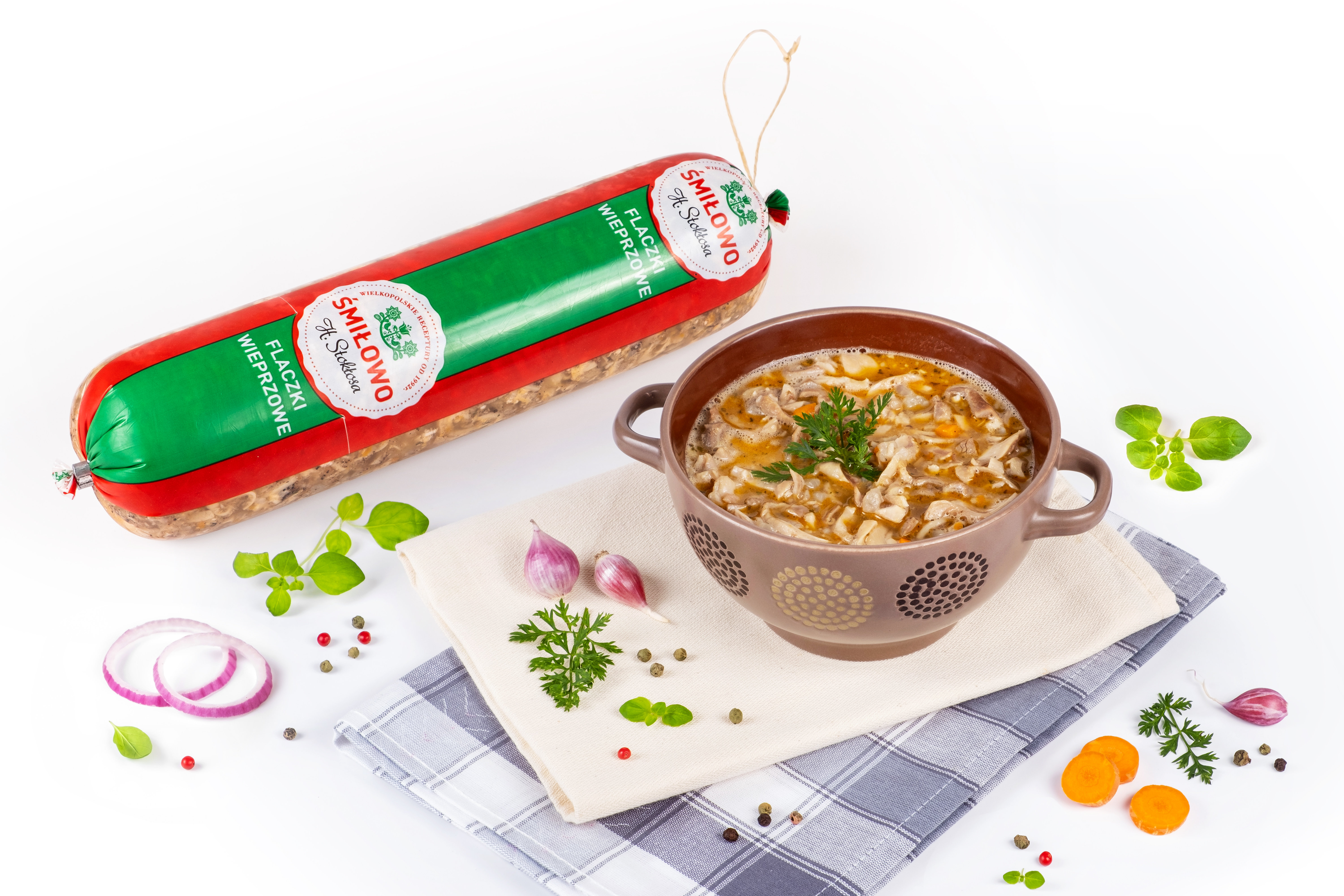Delikatne, pokrojone podroby zanurzone w aromatycznym rosole.