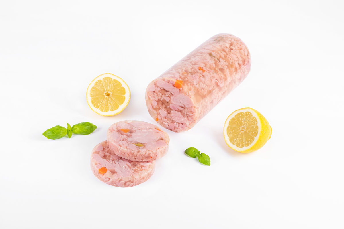 Pokrojona szynka wieprzowa z dodatkiem warzyw i zanurzona w galarecie polecana jest zarówno na kanapki, jak i przekąska na zimno.