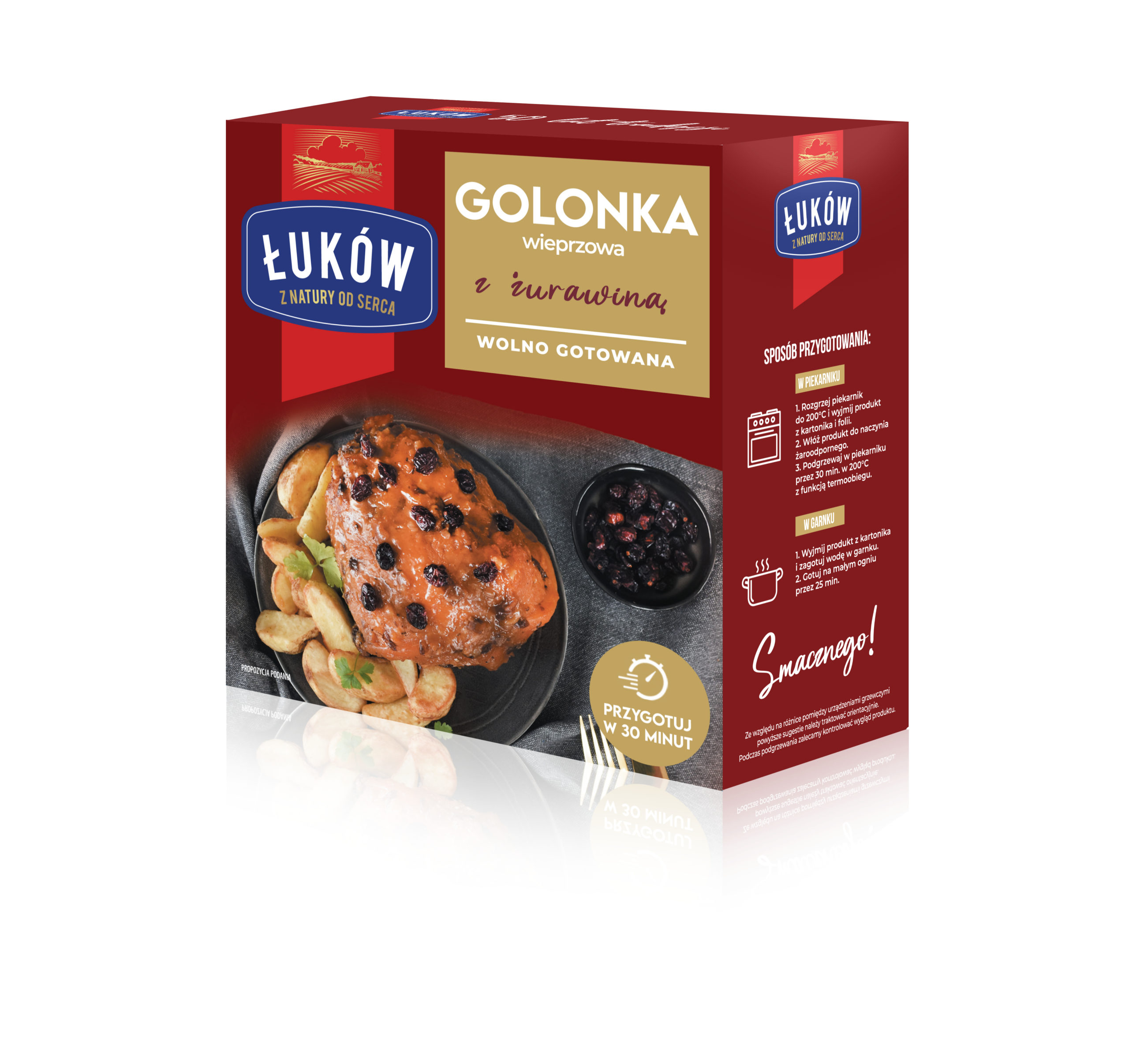 W oparciu o oczekiwania i potrzeby klientów, którzy są coraz bardziej zabiegani i chcą zminimalizować czas spędzony na wypełnianiu obowiązków domowych (m.in. na gotowaniu) proponujemy produkty wolno gotowane. Wyselekcjonowaną golonkę wp. w procesie produkcyjnym otulamy aromatycznym sosem z dodatkiem suszonej żurawiny i w specjalnym worku gotujemy je od 8 do 10 godzin w niskiej temperaturze 85°C, dzięki czemu staje się miękka, rozpływająca się w ustach i zachowuje cenne wartości odżywcze.