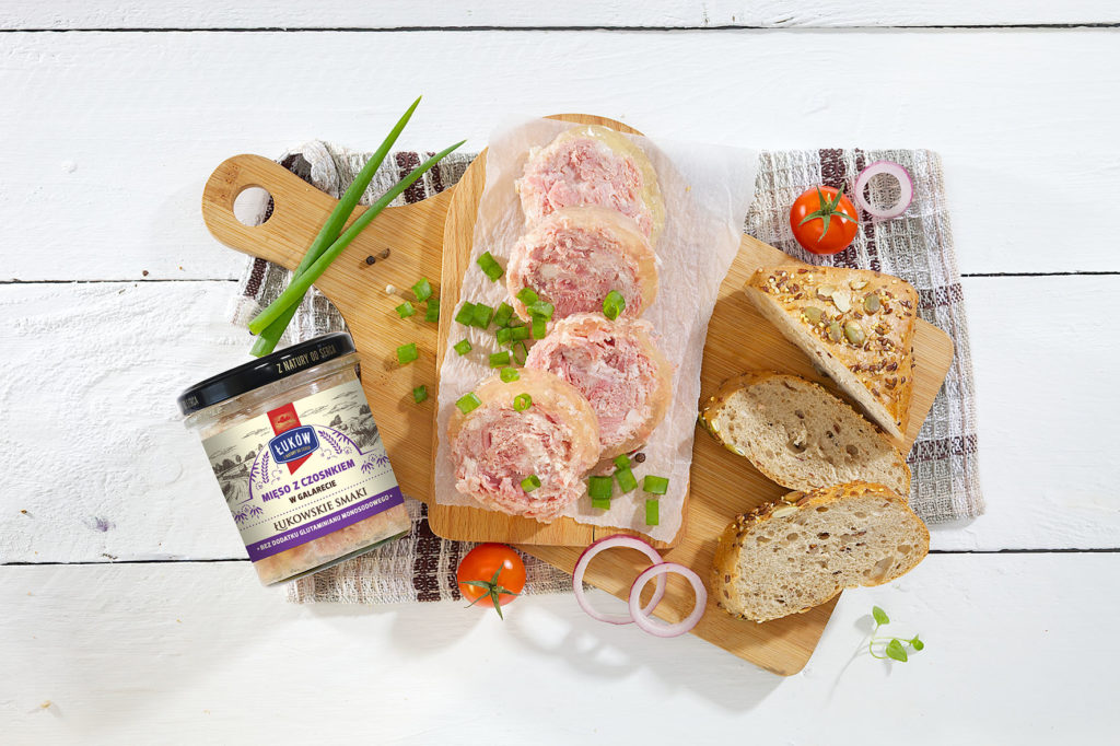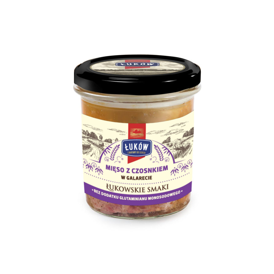 Mięso z czosnkiem w galarecie to wyborne połączenie wysokiej jakości mięsa z aromatycznym czosnkiem. Idealnie pasuje do tradycyjnych kanapek, przekąsek oraz na wyjątkowe okazje, doskonale smakuje ze świeżym chrupiącym pieczywem i masłem.