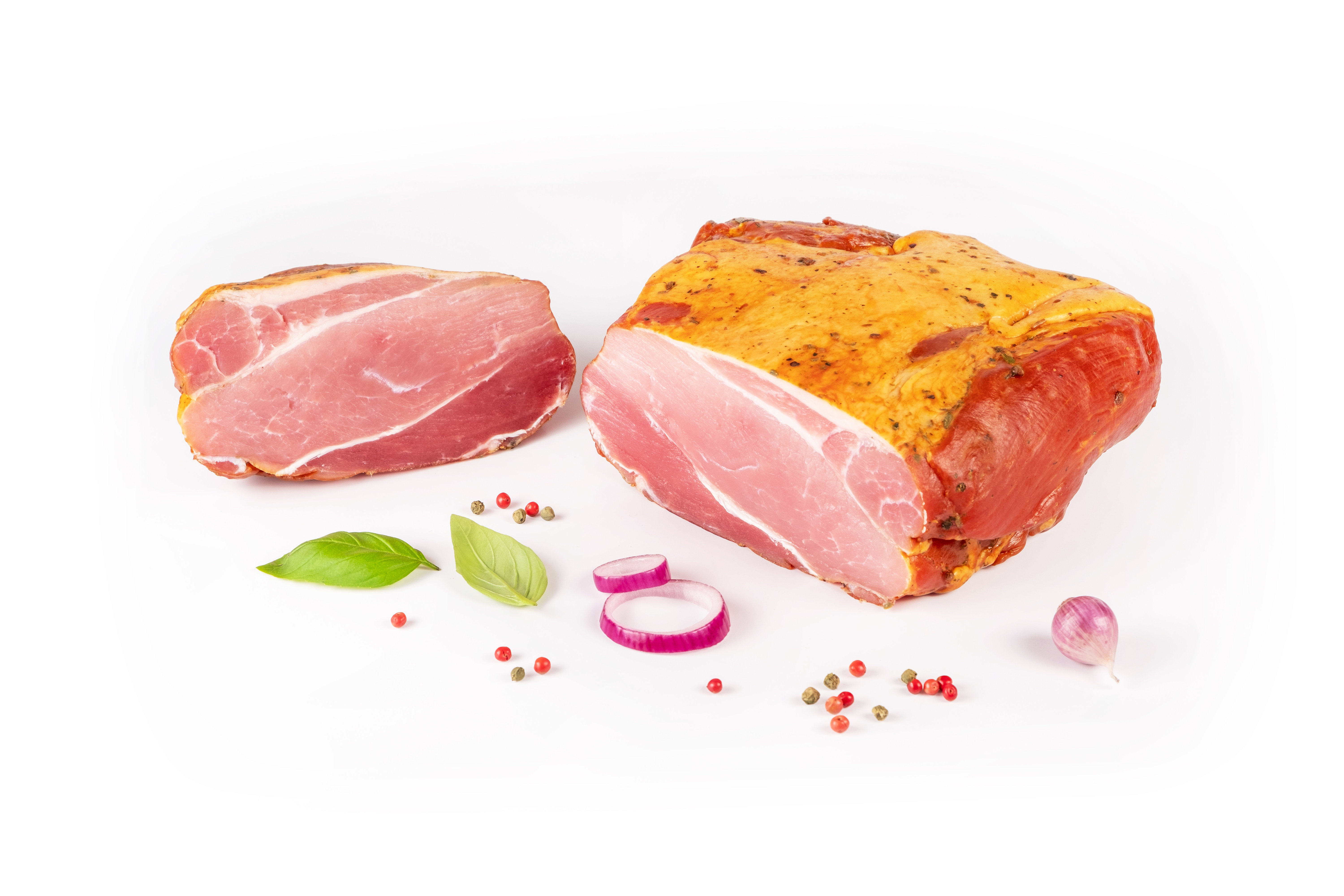 Mięso z szynki wieprzowej w przyprawach dzięki procesowi wędzenia zyskuje oryginalny smak.