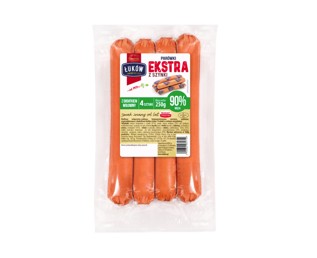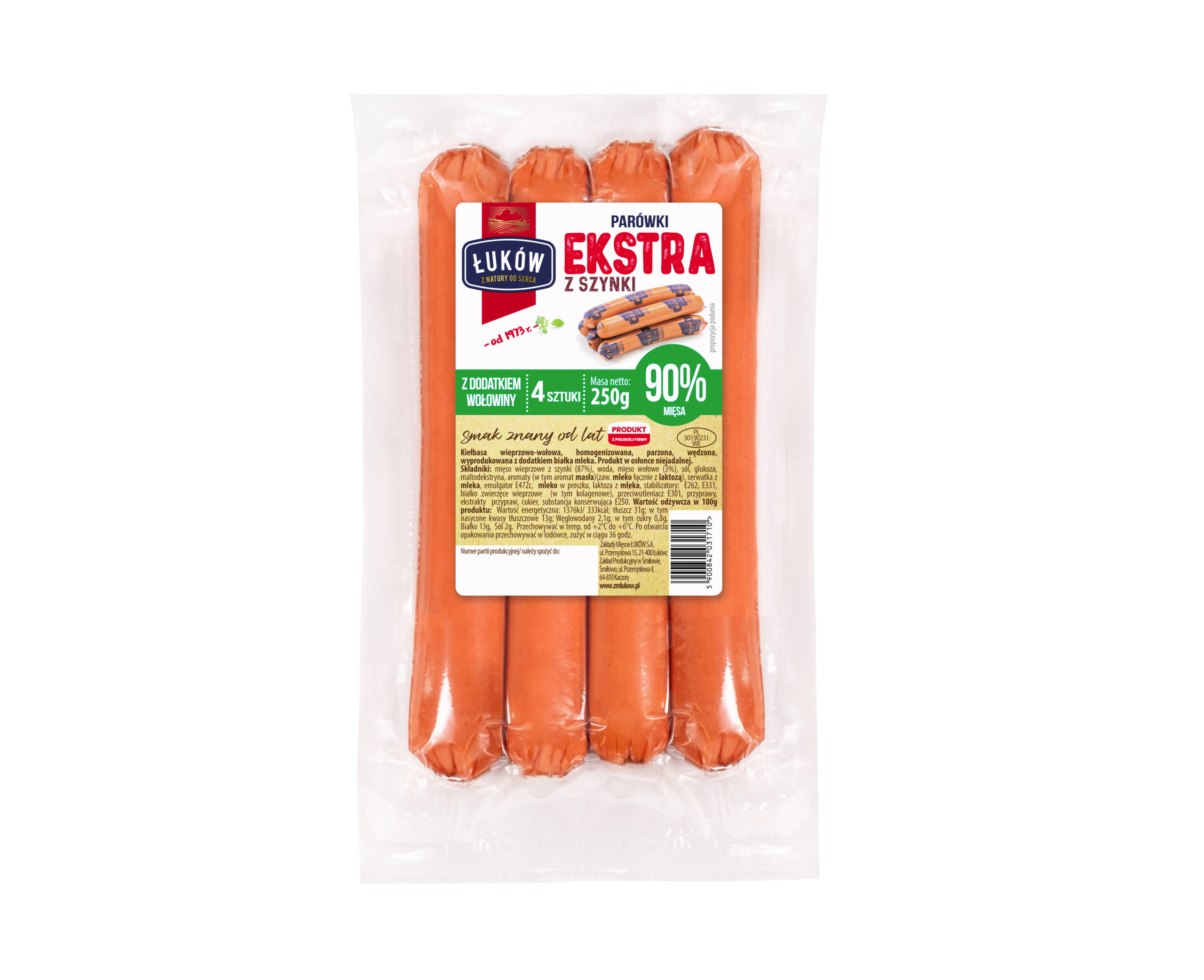 Parówki ekstra to produkt o wysokiej mięsności (90%) od lat doceniany przez klientów. To pyszne połączenie mięsa wieprzowego i wołowego. Stanowią idealną propozycję na pożywne śniadanie. Smakują wybornie na ciepło jak i na zimno.
