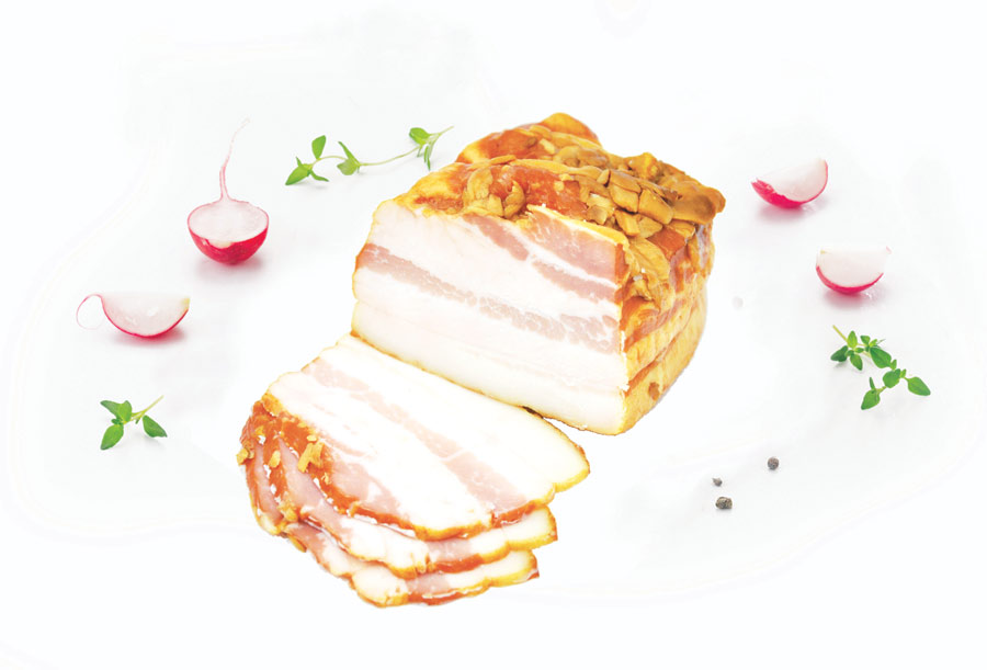 Doskonałej jakości boczek wieprzowy, po dodaniu pełnego aromatu czosnku, zyskuje niezwykle bogaty i wyrazisty smak.