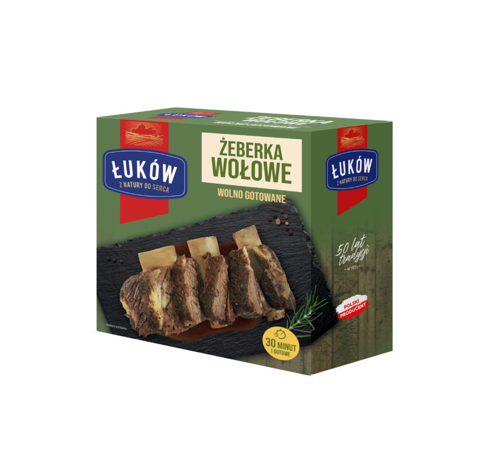Żeberka wołowe wolno gotowane to wyselekcjonowane mięso wołowe z kością w otoczce aromatycznego sosu. Żeberka wołowe zostały poddane procesowi długiego gotowania w niskiej temperaturze (oscylującej wokół 85°C), dzięki czemu stały się miękkie, rozpływające się w ustach i zachowały cenne wartości odżywcze. By móc się cieszyć szybkim, ale zarazem smacznym i sycącym posiłkiem dla całej rodziny wystarczy podgrzać Żeberka wołowe wolno gotowane wraz z sosem w piekarniku, mikrofalówce lub w gorącej wodzie i podać z ulubionymi dodatkami.