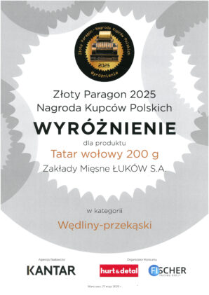 Z satysfakcją informujemy, że nasz Tatar wołowy 200 g został wyróżniony w kategorii „Wędliny – Przekąski” w prestiżowym konkursie Złoty Paragon – Nagroda Kupców Polskich 2025. To szczególne uznanie, ponieważ nagroda przyznawana jest przez praktyków handlu – osoby, które na co dzień podejmują decyzje zakupowe i najlepiej znają preferencje konsumentów.