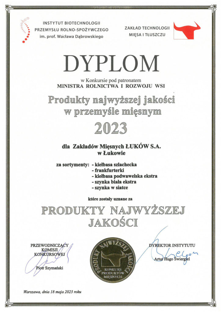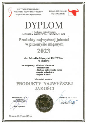 18 maja w Instytucie Biotechnologii Przemysłu Rolno-Spożywczego odbyła się kolejna edycja ogólnopolskiego konkursu pod patronatem Ministra Rolnictwa i Rozwoju Wsi – Produkty najwyższej jakości w przemyśle mięsnym Wiosna 2023. Ideą, która od lat przyświeca temu konkursowi jest wyłonienie produktów wyróżniających się jakością na rynku wędlin. W tej edycji konkursu tytuł Produkt Najwyższej Jakości zdobyło aż 5 przepysznych produktów z Łukowa – Kiełbasa szlachecka, Kiełbasa podwawelska ekstra, Frankfurterki oraz szynki – Szynka biała ekstra oraz Szynka w siatce.