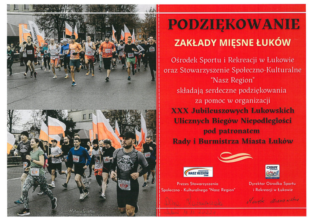 W dniu 11 listopada 2022 r. Ośrodek Sportu i Rekreacji w Łukowie oraz Stowarzyszenie Społeczno – Kulturalne „Nasz Region” zorganizowali „XXX Jubileuszowe Łukowskie Uliczne Biegi Niepodległości pod patronatem Rady i Burmistrza Miasta Łuków”. Zakłady Mięsne Łuków S.A. zapewniły zawodnikom posiłek regeneracyjny w formie pysznej kiełbasy.