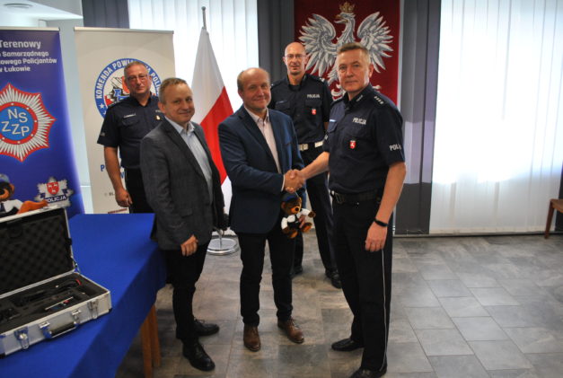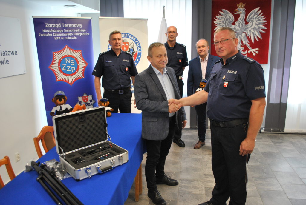 W obecności I Zastępcy Komendanta Powiatowego Policji w Łukowie nadkom. Leszka Dołęgi, Dariusz Siwek – Vice Prezes Zarządu Zakładów Mięsnych ŁUKÓW S.A. i Artur Osiak – Dyrektor Handlowy Zakładów Mięsnych ŁUKÓW S.A. przekazali Przewodniczącemu Zarządu Terenowego Niezależnego Samorządnego Związku Zawodowego Policjantów w Łukowie sonometr. Dzięki nowemu urządzeniu mundurowi precyzyjnie sprawdzą poziom głośności dźwięku kontrolowanego pojazdu i zweryfikują czy mieści się on w dopuszczalnych normach.